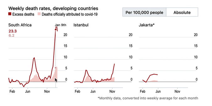 The Economist is known for its Daily Chart, but this interactive example presented the concept of excess deaths compared across countries, with a switch between viewing absolute and proportional numbers.