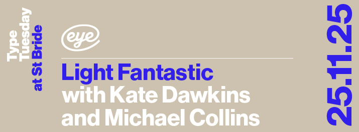We are excited to announce the details of our next Type Tuesday, ‘Light Fantastic’, with Kate Dawkins and Michael Collins on 25 November at St Bride Foundation. Hot on the heels of our sell-out ‘My favourite logo’, this Eye 109 preview event will feature the spectacular work of multi-BAFTA-winning video designer and creative director Kate Dawkins; and photographer, essayist, picture editor and lecturer Michael Collins. Simon and John will introduce them and also preview some further highlights from the forthcoming issue of Eye.