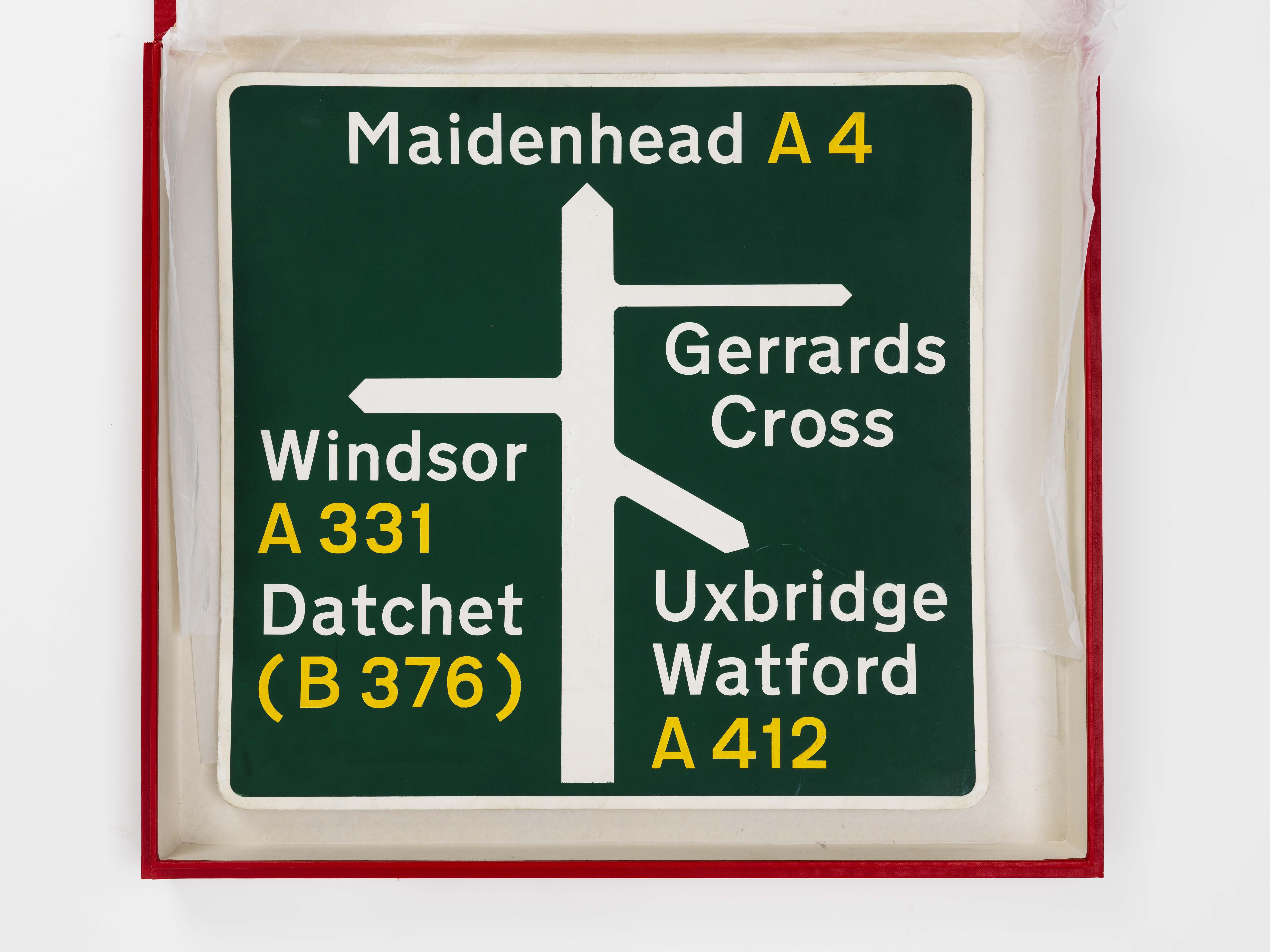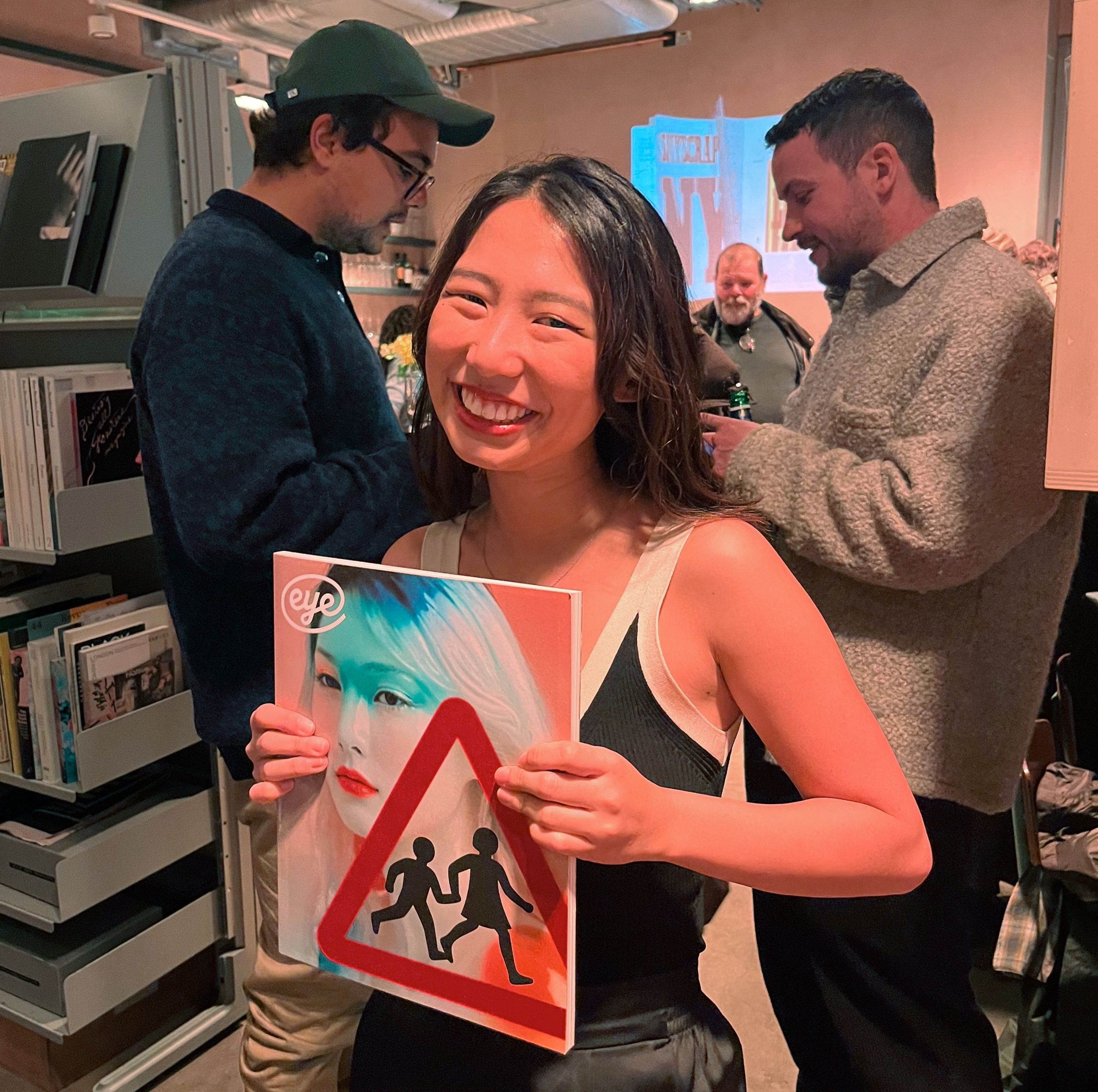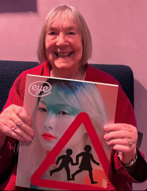 Field’s Jann Choy holding Eye 107, which features her AI avatar on the cover, juxtaposed with the ‘Children crossing’ sign designed by Jock Kinneir and Margaret Calvert.
