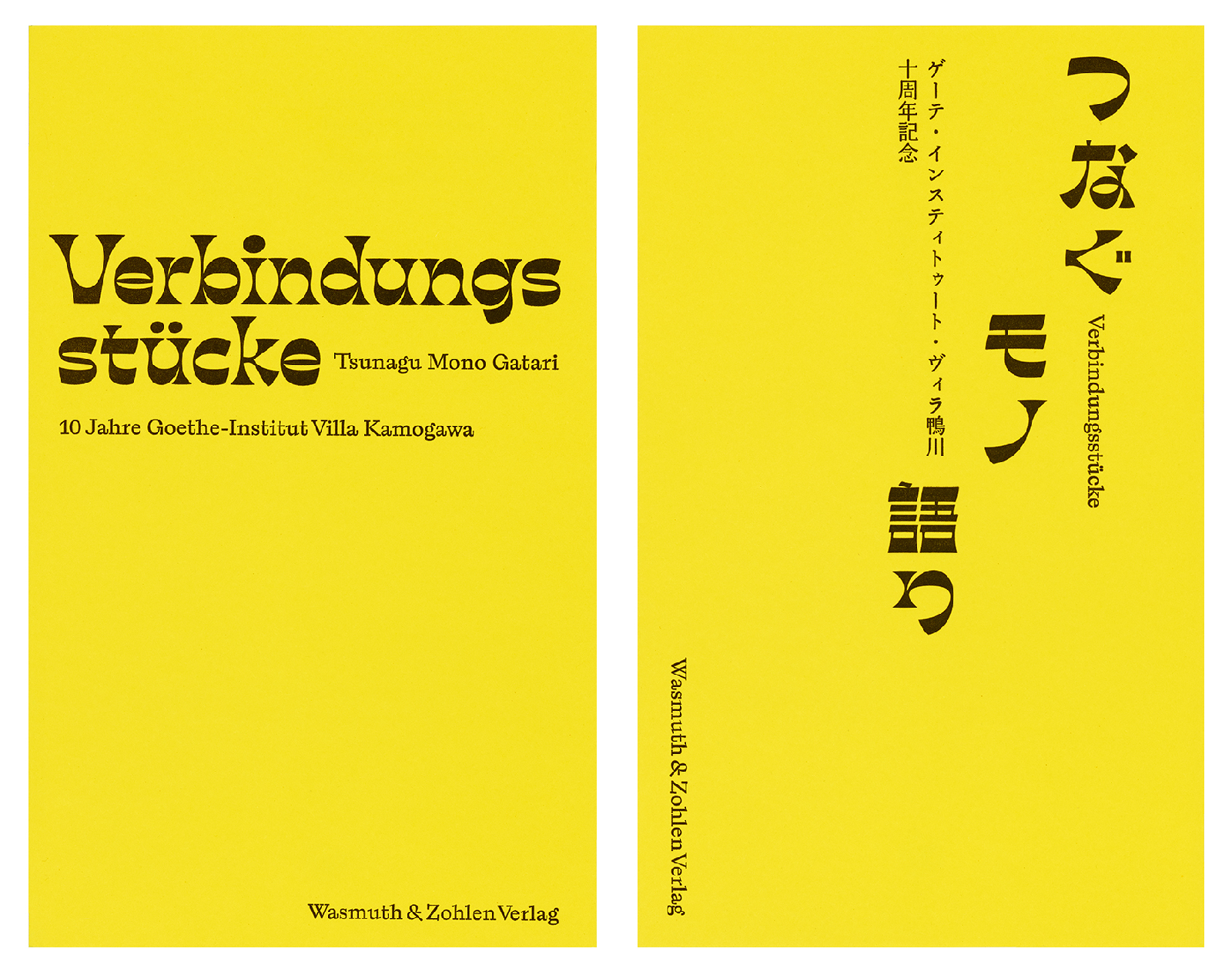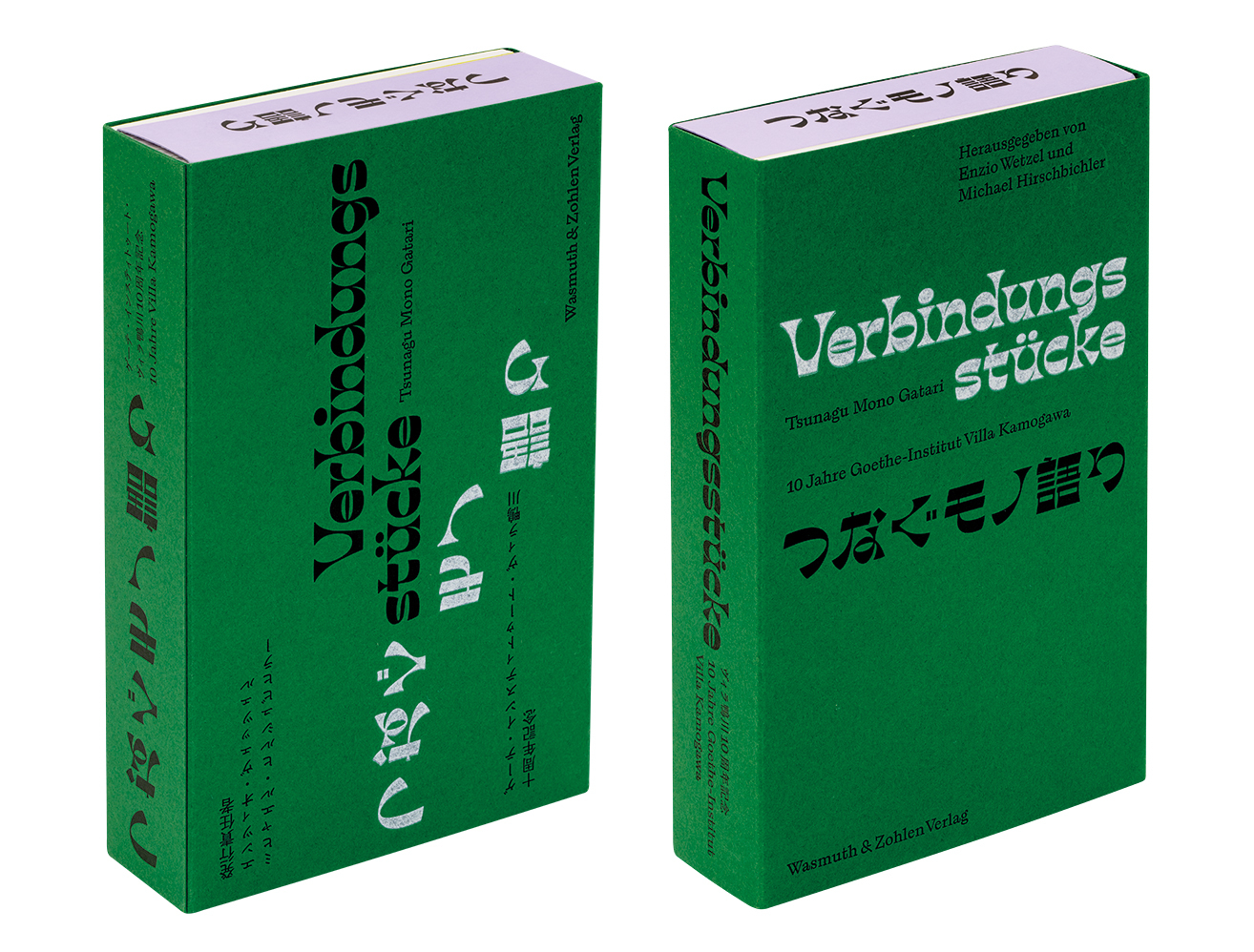 Tsunagu Mono Gatari / Verbindungsstücke, a bilingual pack of 73 artist cards held in two tactile sleeves (green and lavender) with an accompanying 60-page booklet. Top. The booklet for Tsunagu Mono Gatari / Verbindungsstücke has two ‘front covers’, one in vertically set Japanese, the other in German.