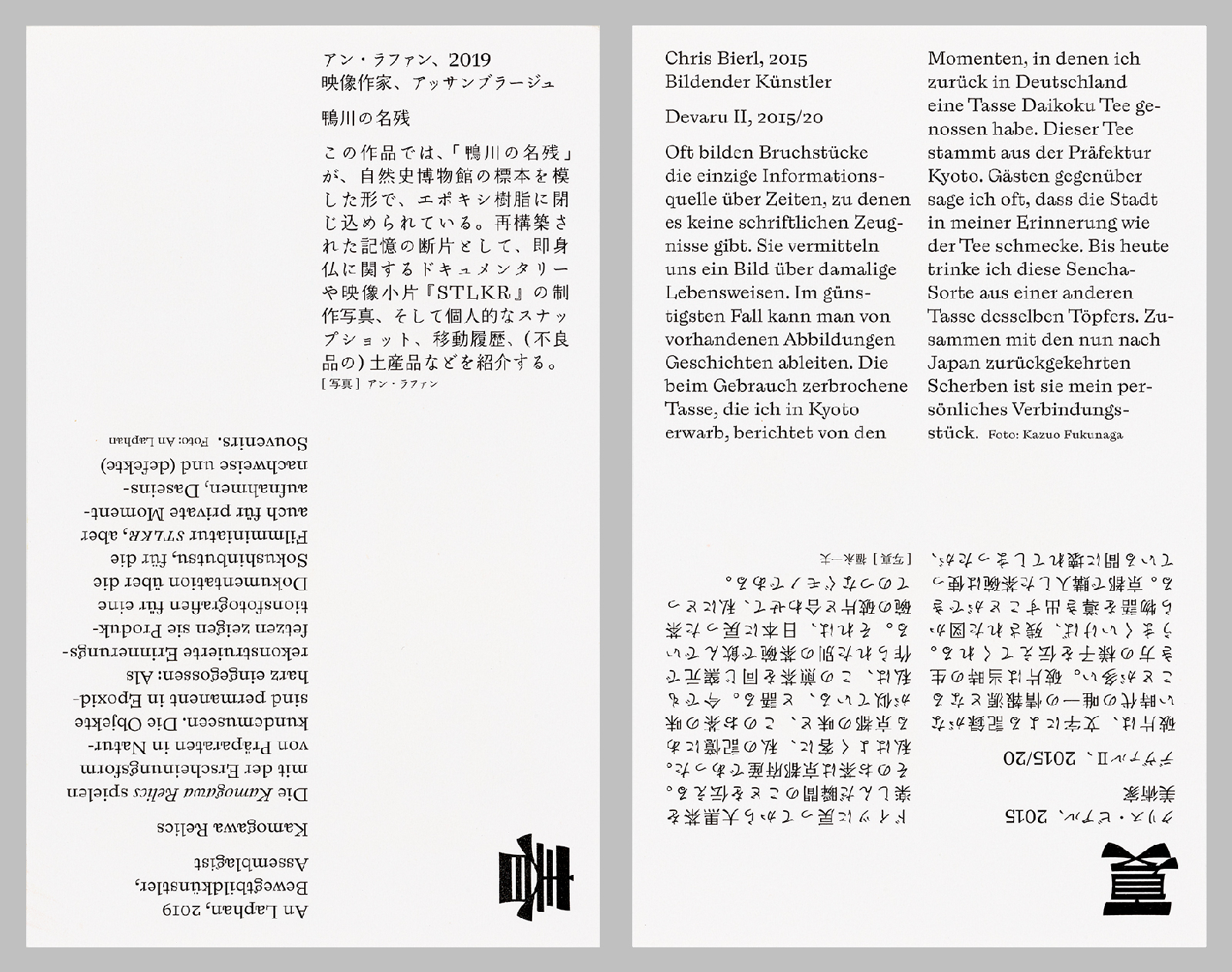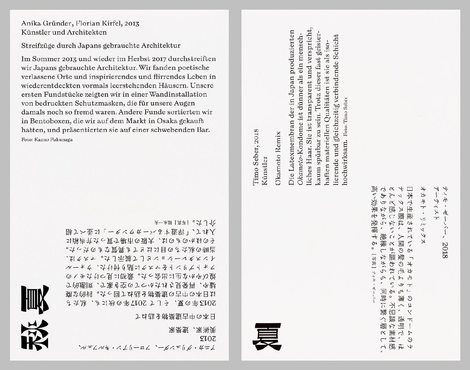 The result is a gallery in the hands, a retrospective of the Kyoto Goethe Institute’s Villa Kamogawa artist residency programme on its tenth anniversary. The artist cards feature an image on one side and captions in both languages on the other.