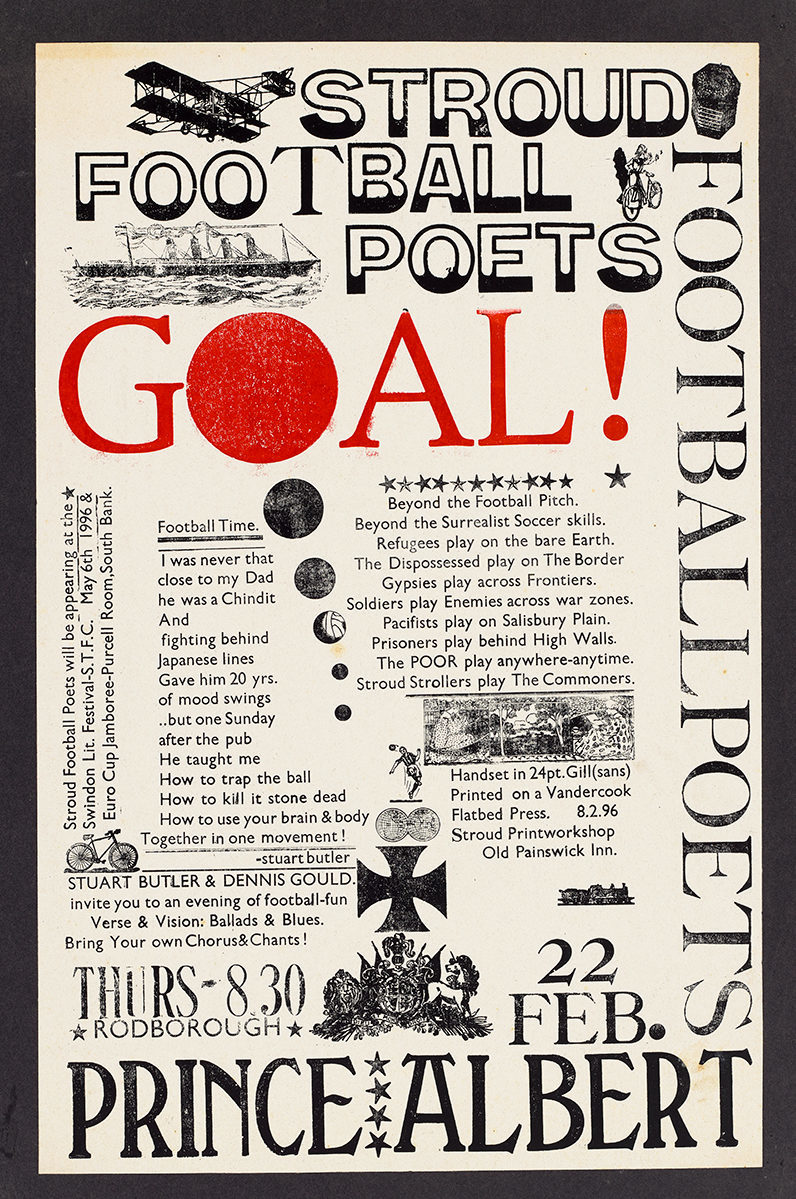Dennis Gould’s poster for an evening event staged by the ‘Stroud Football Poets’, printed on a Vandercook flatbed press, 1996. See ‘The creative anarchist’.