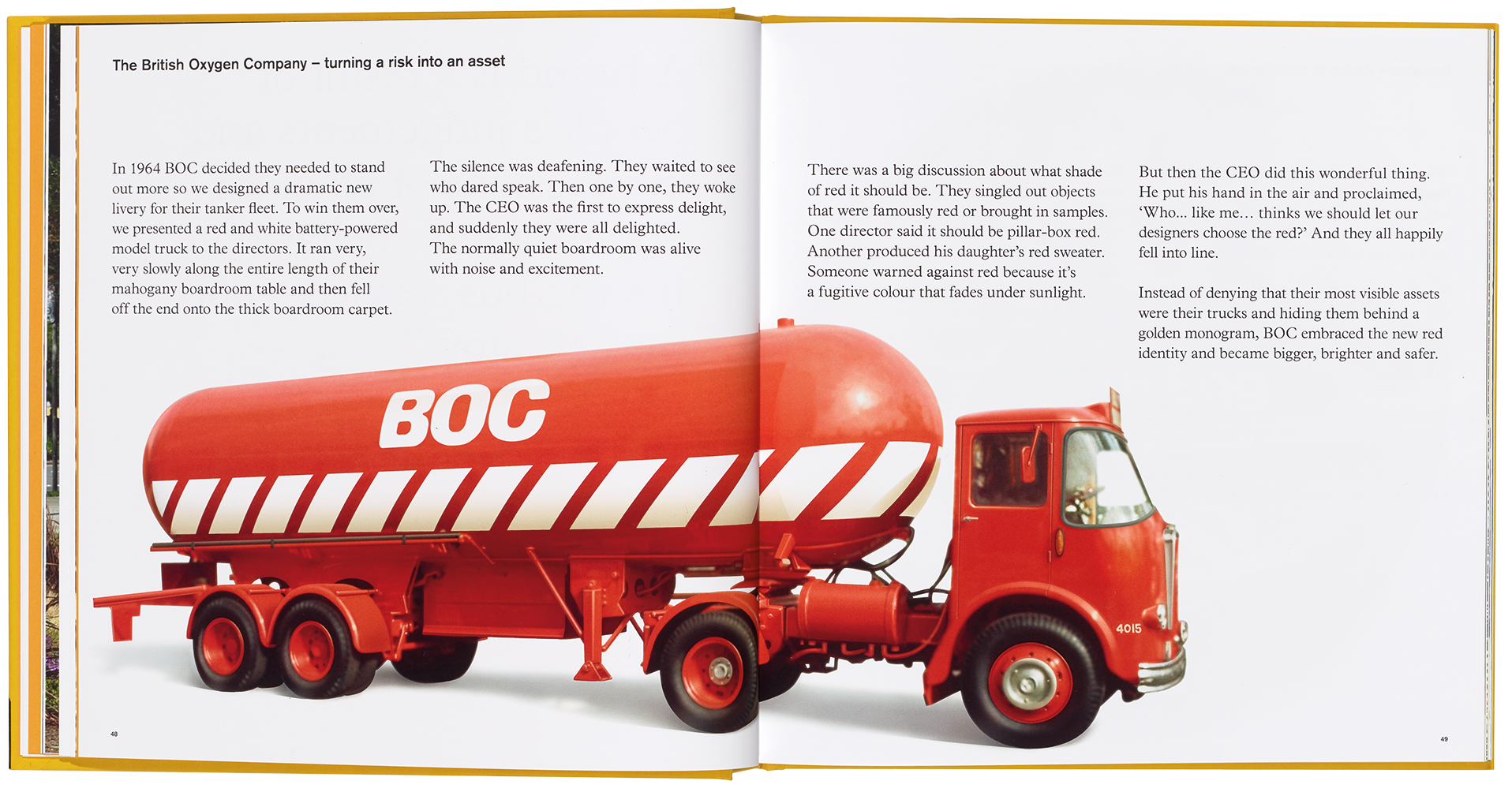 Right: Wolff Olins painted BOC’s tankers red with a hazard stripe, 1964. ‘The trucks were their most visible asset,’ says Wolff.