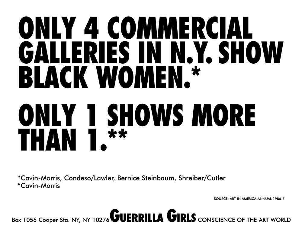 Guerrilla Girls, ‘Only 4 Commercial Galleries in NY Show Black Women’, 1986. Courtesy guerrillagirls.com.