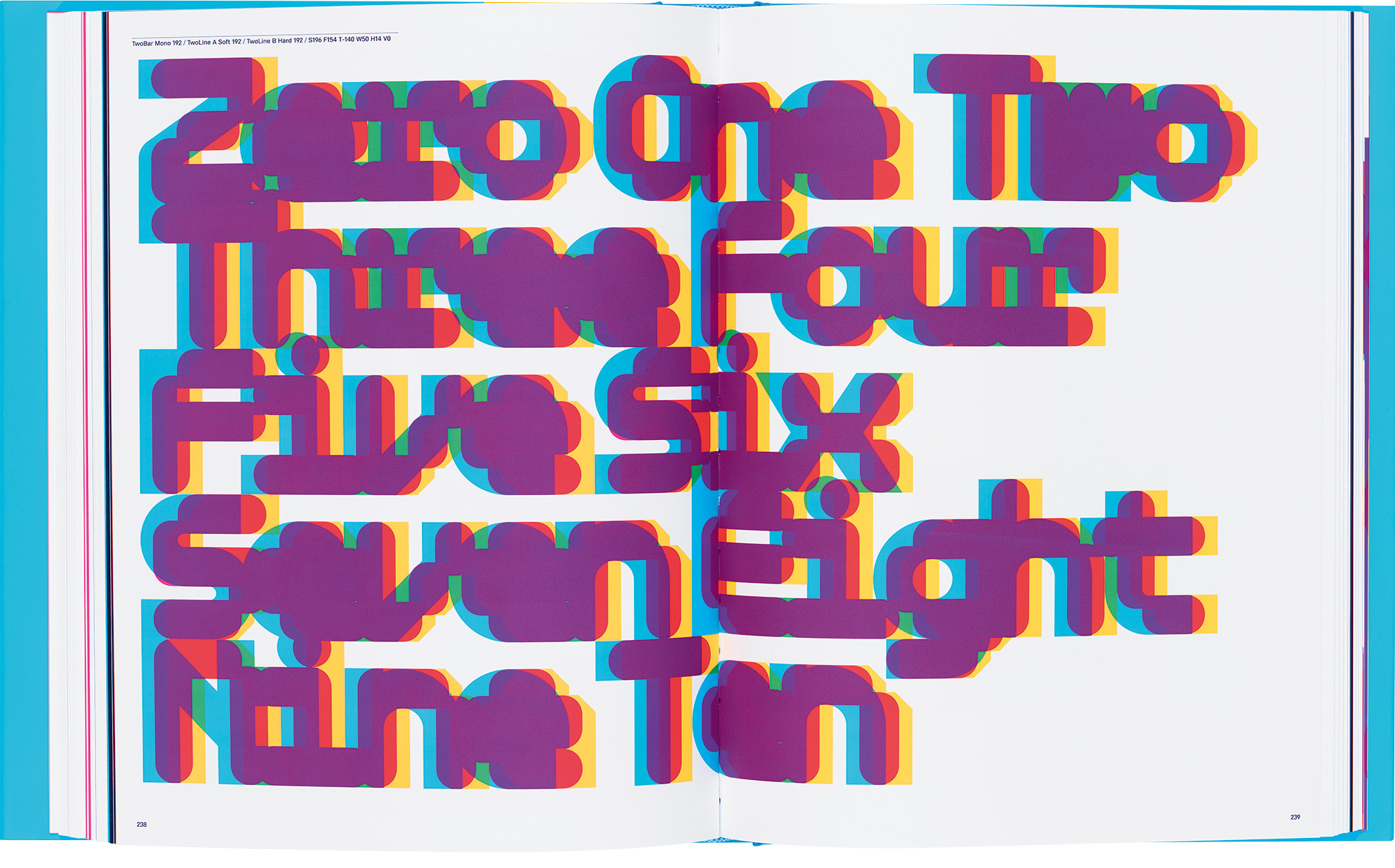 It starts off by simply showing the variations of the modular type – each adjusted weight shows the progression from light to black weights. Relatively basic monospaced fonts are deconstructed then reconstructed. The work gradually builds over three distinct sections with more and more overlapping and multiplied colour and shape. As you turn the pages you are taken on a journey from readable letters to typographic and graphic joy. The letterforms build up to and over the edge of legibility into pure abstraction.