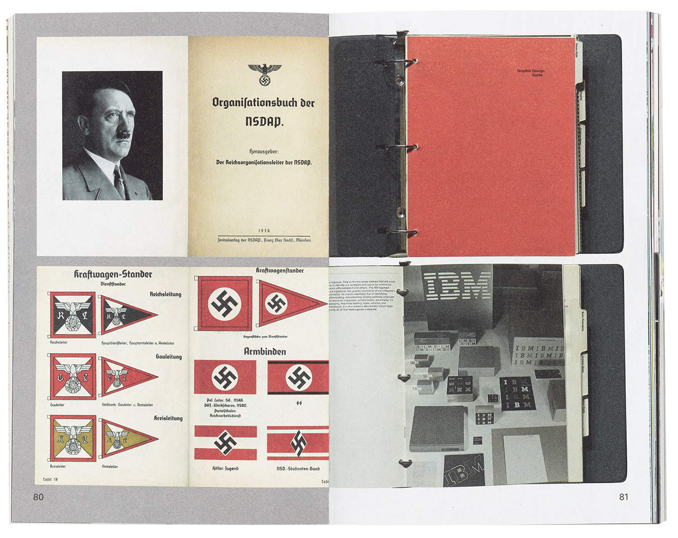 Top. Spread from What is Post-Branding? showing pages from the organisational handbook of the National Socialist Party (1936) opposite pages from an IBM graphic design guide by Paul Rand (1981).