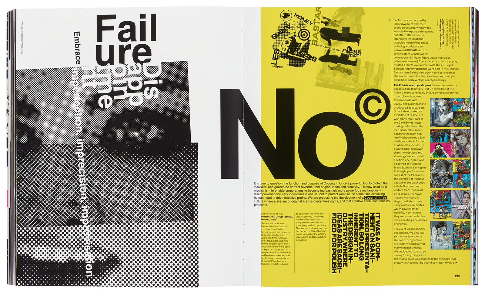 Top. Spread collaging posters for the Anti Design Festival (2010). The design expresses the emotion of the event itself rather than show a series of its posters.