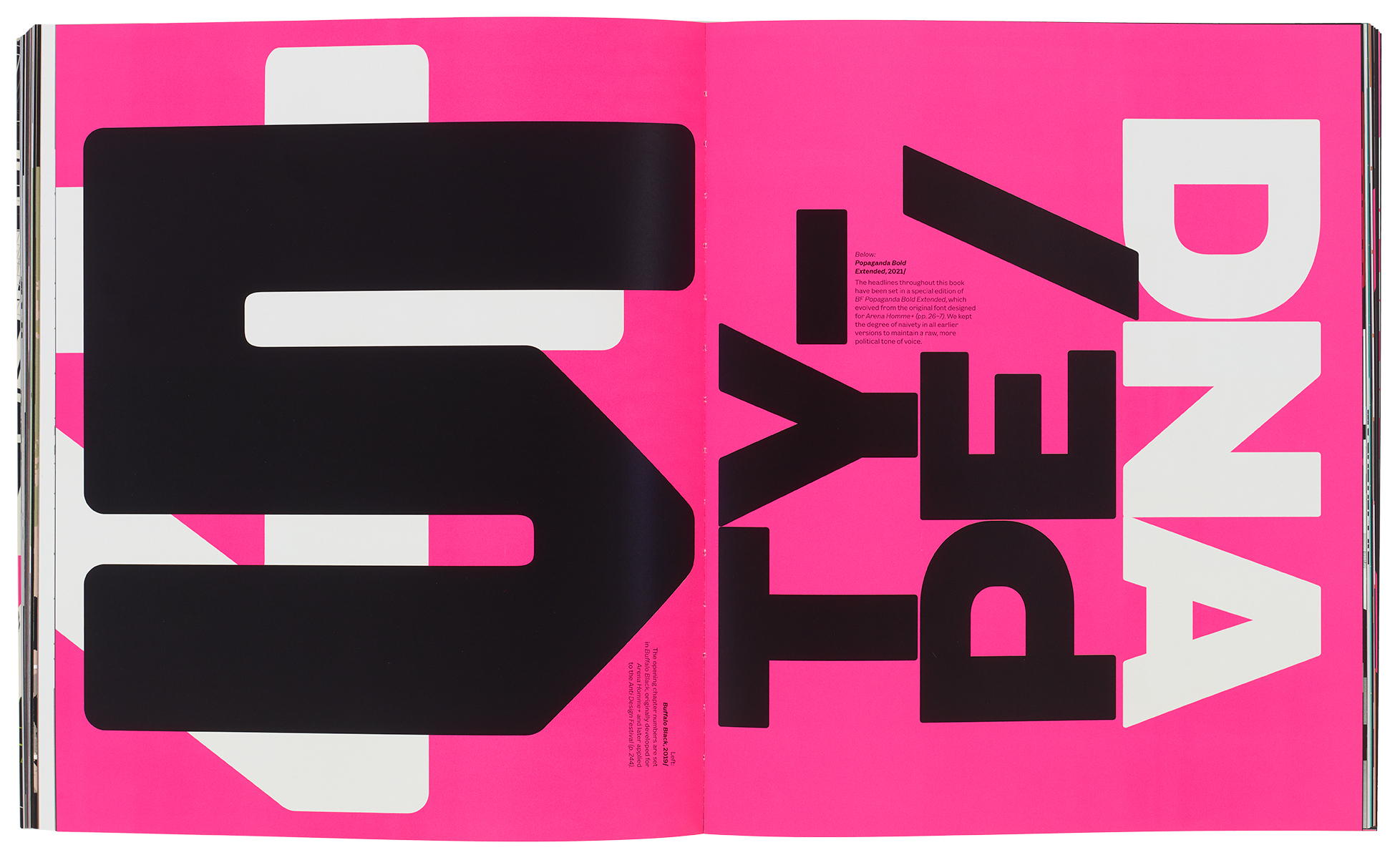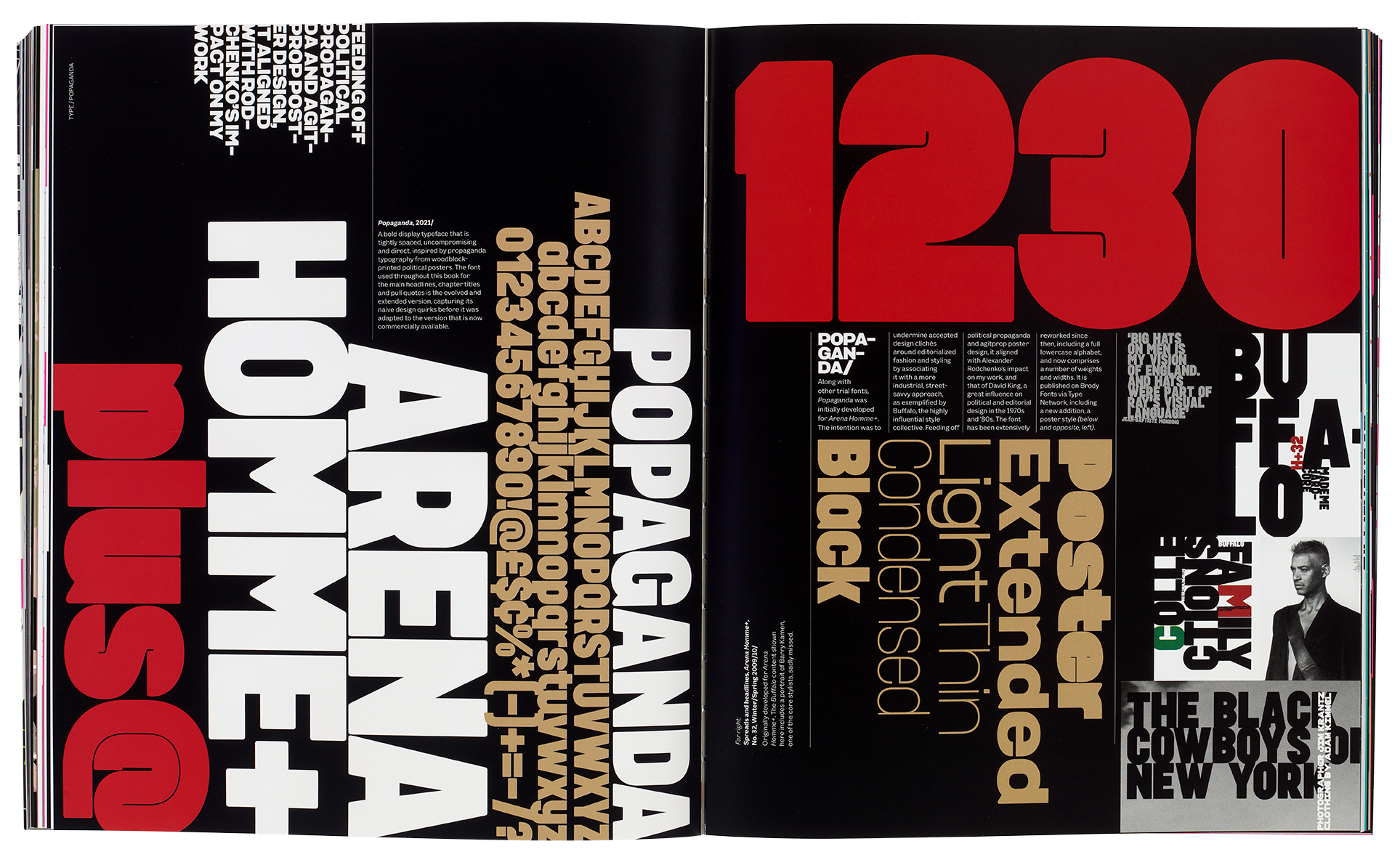 Spread showing Brody’s type design Popaganda, with text bleeding off, set on the page at opposing angles and thumbnail insets of its use in Arena Homme+, for which it was designed.