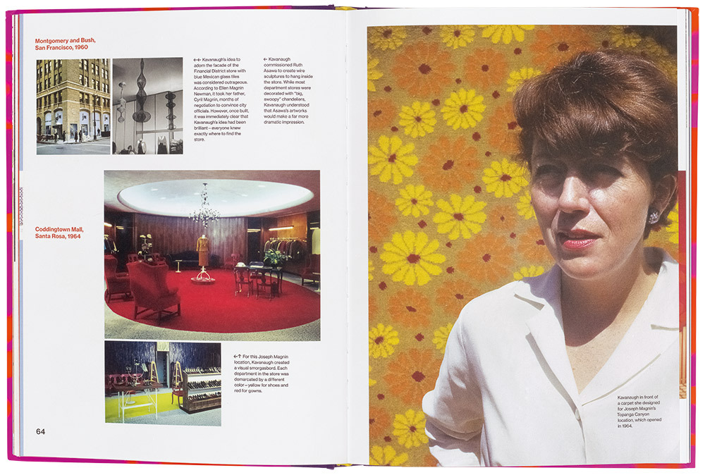 Establishing her independent design practice in 1964, Kavanaugh designed numerous offices, retail spaces and residences, and worked with clients ranging from Neutrogena, Aardvark Letterpress and Joseph Magnin (she designed the interiors, colours and display furniture, in collaboration with architect Frank Gehry and graphic designer Deborah Sussman) to Isabel Scott Fabrics (with whom she worked closely to help establish a factory in South Korea). She later founded her own textiles company, Geraldine Fabrics, in 1972.