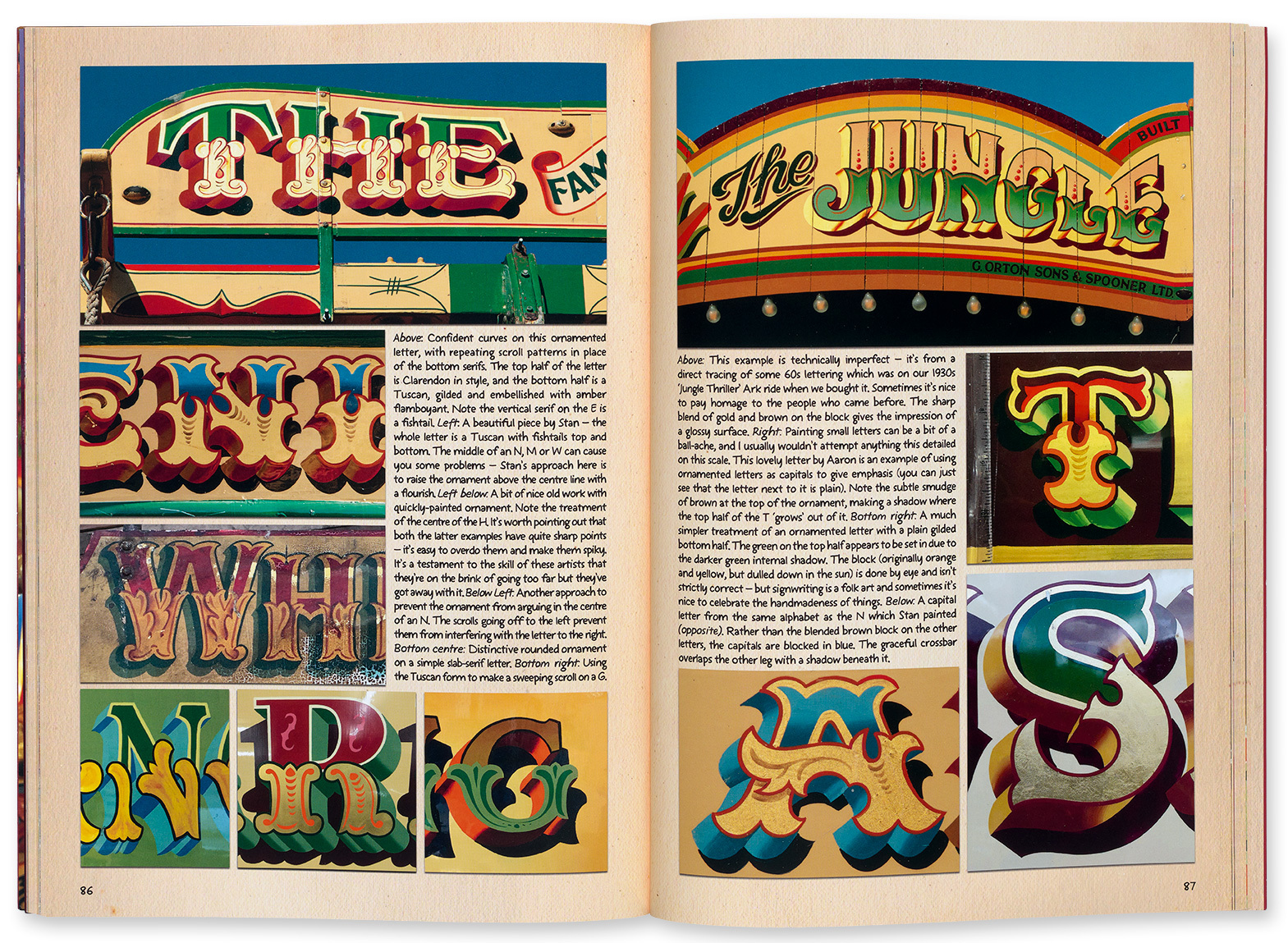 Although the ostensible purpose is to instruct, the authors’ enthusiasm for the over-the-top showmanship of fairground lettering and art is shot through with references to Carter’s illustrious forebears, including Sid Howell, Charles Duffield, Edwin Hall and the influential Fred Fowle (see ‘Painted thrills and spills’ in Eye 86), and he frequently pays tribute to Stan Wilkinson, his teacher.